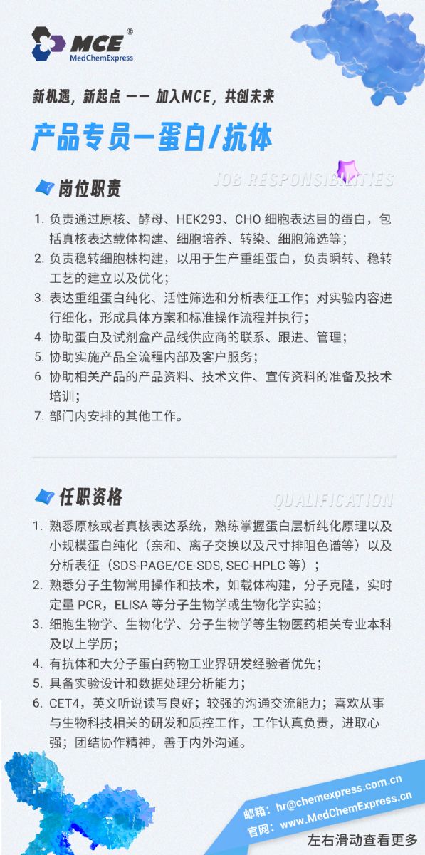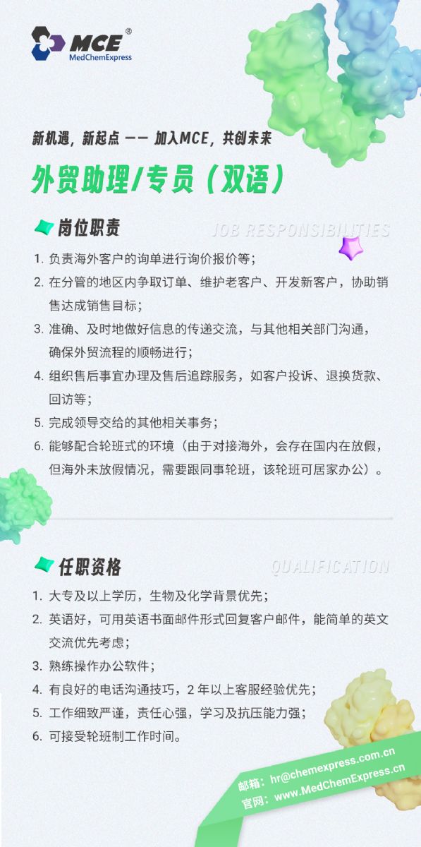 MedChemExpress —— 生物活性化合物領(lǐng)域的先行者,我們不僅提供高質(zhì)量的產(chǎn)品,更提供夢(mèng)想的舞臺(tái)!我們擁有深厚的行業(yè)經(jīng)驗(yàn)和完善的管理體系。我們重視每一位員工的成長(zhǎng),致力于打造一個(gè)充滿(mǎn)活力、專(zhuān)業(yè)的團(tuán)隊(duì)。加入我們,成為MCE大家庭的一員!