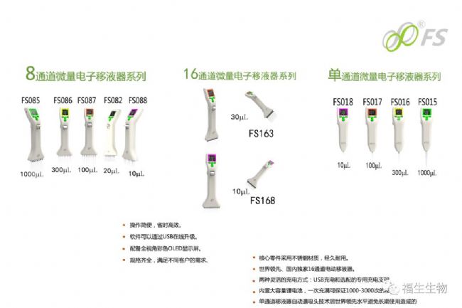 福生系列電動移液器性能可靠,功能領先,多種規(guī)格,滿足用戶個性化需求。系列包含單通道的5種規(guī)格;8通道5種規(guī)格;16通道3種規(guī)格以及搭配的4款充電支架共17款產品。