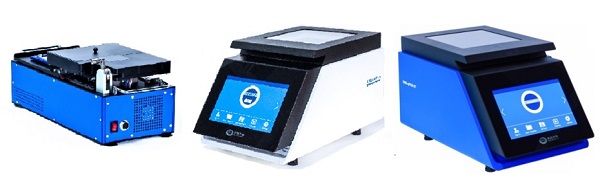 從左到右分別為DBS-3000 Mini™液體工作站快速定量PCR儀, DBS-LibPrep™高通量測序自動建庫儀, DBS-qPCR HT™快速液滴定量PCR