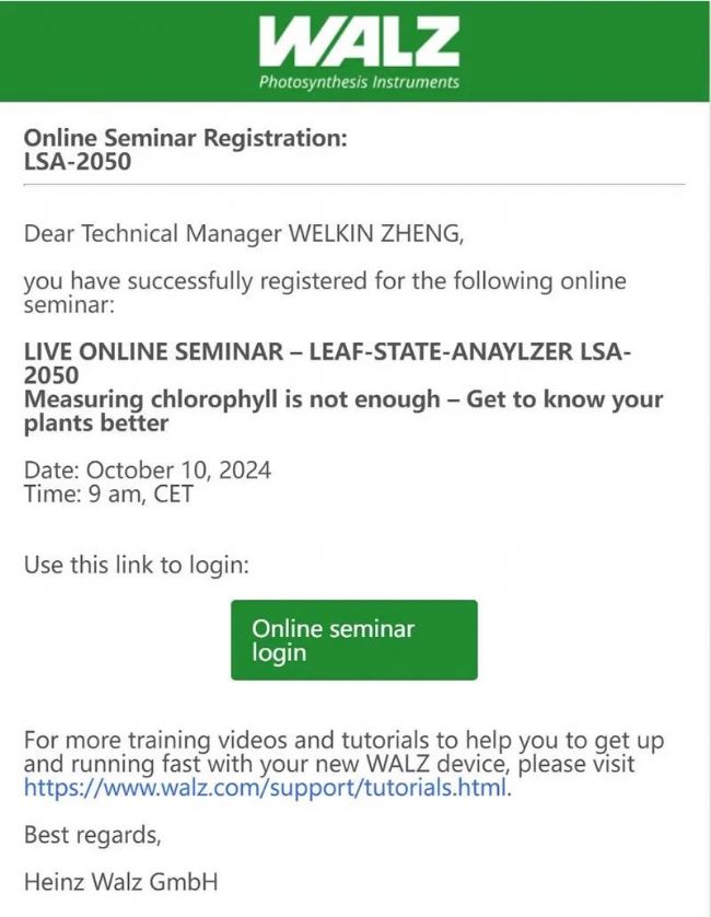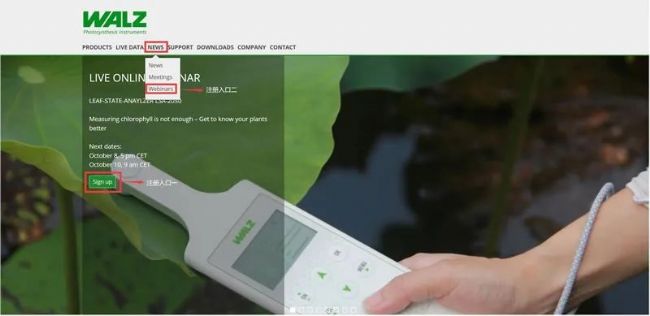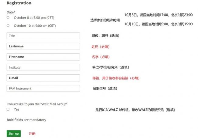 打開德國WALZ公司官網(wǎng)(www.walz.com)即可看到注冊入口,點擊Sign up,可直達(dá)注冊頁面,選擇參與的場次時間,填寫信息,點擊Sign up注冊,之后不久就會收到回執(zhí)郵件。郵件包含參會鏈接,開會當(dāng)天,點擊Online seminar login即可參會。