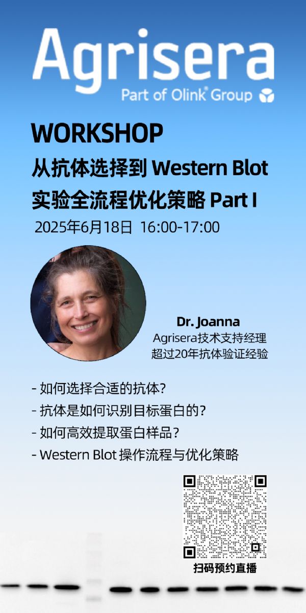Western Blot實(shí)驗(yàn)效率與結(jié)果的可靠性,很大程度上取決于對抗體特性的理解、正確的選擇以及實(shí)驗(yàn)流程的優(yōu)化。為解決WB實(shí)驗(yàn)過程中的常見問題,Agrisera技術(shù)專家Joanna博士將為大家?guī)鞼B全流程優(yōu)化系列講座,本系列講座包含兩次線上直播課程,6月18日下午4點(diǎn)直播第一次課程:從抗體選擇到WB全流程優(yōu)化策略,深度解析Western Blot技術(shù)的關(guān)鍵環(huán)節(jié),為您提供專業(yè)的優(yōu)化方案,歡迎大家提前報名預(yù)約。