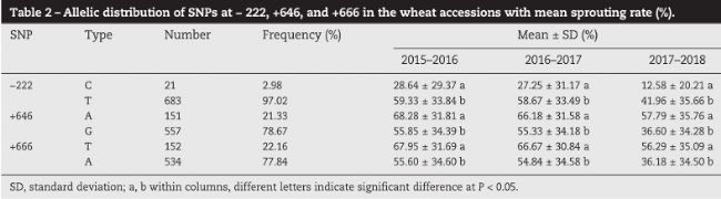 基于穗發(fā)芽會導(dǎo)致小麥產(chǎn)量和最終使用質(zhì)量的損失問題。在本研究中,通過對725份中國小麥材料在三種環(huán)境中的穗發(fā)芽抗性進行研究評價,分析TaPHS1在222、646和666堿基處的三個因果單核苷酸多態(tài)性的分布,并確定頻率。最后得出:具有優(yōu)良TaPHS1單倍型的材料對穗發(fā)芽具有抗性,為通過標(biāo)記輔助育種開發(fā)穗發(fā)芽抗性品種提供了良好基礎(chǔ)。