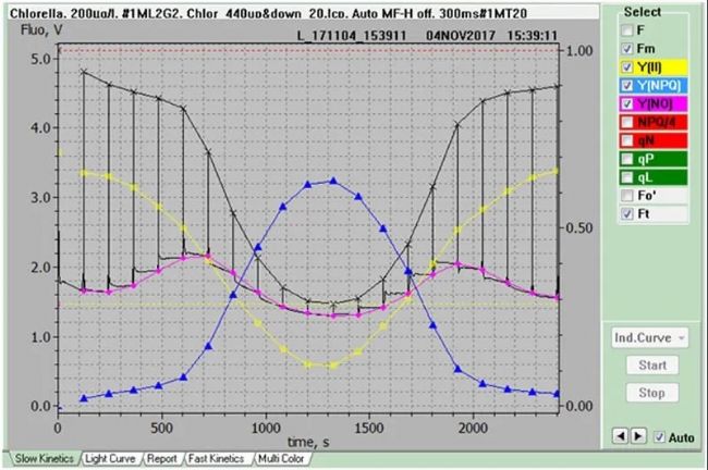 上圖是測量PS II互補(bǔ)量子產(chǎn)率Y(II)+Y(NPQ)+Y(NO)=1的光曲線示例。由于記憶效應(yīng),光強(qiáng)減弱時(shí)誘導(dǎo)的動(dòng)力學(xué)可能與光強(qiáng)增強(qiáng)時(shí)不同。這種現(xiàn)象被稱為滯后。這里觀察到的光誘導(dǎo)Y(II)降低和Y(NPQ)升高的完全可逆性是生理健康樣品的特征。