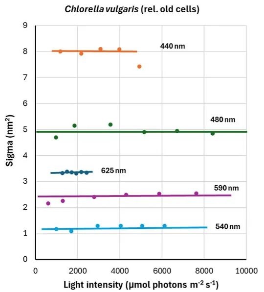 參數(shù)Sigma(II)反映了PSⅡ捕光天線的有效截面。Sigma(Ⅱ)的測定(及其波長依賴性)是另一種PAM快速動(dòng)力學(xué)測量的應(yīng)用。有三個(gè)標(biāo)準(zhǔn)可以用來判斷用于 Sigma(Ⅱ)測定的O-I1擬合是否良好:1. 擬合應(yīng)能很好地描述熒光的上升;2. 得到的擬合參數(shù)應(yīng)與生理相關(guān);3. 獲得的Sigma(Ⅱ)值應(yīng)與光照強(qiáng)度無關(guān)。在這里,觀察到Sigma(Ⅱ)值隨著所用培養(yǎng)物的階段而增加。