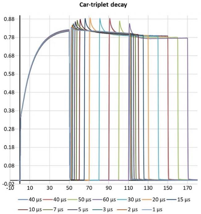 下圖顯示了一組測量值,根據(jù)這些測量值可以確定類胡蘿卜素三重態(tài)衰變動(dòng)力學(xué)。該數(shù)據(jù)集說明了閃光時(shí)間的精度,以及閃光燈提供兩次相隔1μs的相同強(qiáng)度閃光的能力。