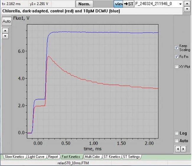 在PAM測量中,對受DCMU抑制(藍(lán)色)或未受抑制(紅色)的稀釋小球藻樣本施加3 µs STK閃光。從閃光后100 µs開始,ML頻率從100 kHz對數(shù)下降到10 kHz(圖摘自Klughammer等人,2024年)。