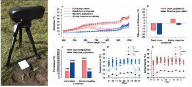 高光譜成像技術(shù)在蜥蜴體色適應(yīng)性進(jìn)化研究的應(yīng)用:該成果以青藏高原分布的貴德沙蜥(Phrynocephalus putjatai)物種為研究對象,綜合野外生態(tài)實驗、基因組測序和遺傳驗證等手段,論證了貴德沙蜥體色本地適應(yīng)的驅(qū)動力和分子機制。