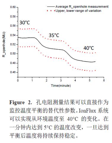 溫度改變可以通過(guò)細(xì)胞添加前孔電阻變化的測(cè)量進(jìn)行監(jiān)控。緩沖液的電導(dǎo)是溫度依賴性的且隨著溫度的升高而增加。圖2 顯示了孔電阻測(cè)量結(jié)果可以直接作為監(jiān)控溫度平衡的替代性參數(shù)。IonFlux 系統(tǒng)可以實(shí)現(xiàn)從環(huán)境溫度至40°C 的變化。在一分鐘內(nèi)達(dá)到5°C 的溫度改變,一旦達(dá)到平衡后溫度將持續(xù)保持穩(wěn)定。