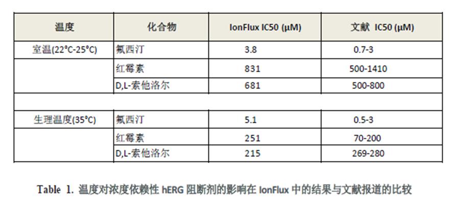 為滿足這樣的需求,IonFlux 系統(tǒng)配置溫度控制模塊,使得用戶可以運(yùn)行溫度依賴性的電生理篩選。在本片文章中,我們展示了hERG 通道的藥理學(xué)和動(dòng)力學(xué)特性,比較了IonFlux 平臺(tái)記錄的室溫條件與生理溫度條件的結(jié)果。