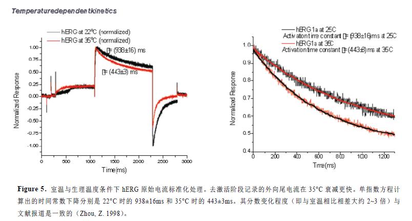 動(dòng)力學(xué)轉(zhuǎn)換的檢測(cè)提供更多關(guān)于溫度對(duì)離子通道電流影響的信息。我們研究比較了室溫和生理溫度條件下的hERG 原始電流圖(圖5)。首先,相比于22°C,35°C 條件下同一個(gè)集合細(xì)胞記錄的電流幅度幾乎超過(guò)兩倍。其次,去激活階段記錄的外向尾電流在35°C 時(shí)同樣表現(xiàn)出更快的衰減速度。單指數(shù)方程計(jì)算出的時(shí)間常數(shù)下降分別是22°C 時(shí)的938±16ms 和35°C 時(shí)的443±3ms。盡管時(shí)間常數(shù)的絕對(duì)值取決于激活的電壓刺激方案,但其分?jǐn)?shù)變化程度(即與室溫相比相差大約2~3 倍)與文獻(xiàn)報(bào)道是一致的(Zhou, Z. 1998)。