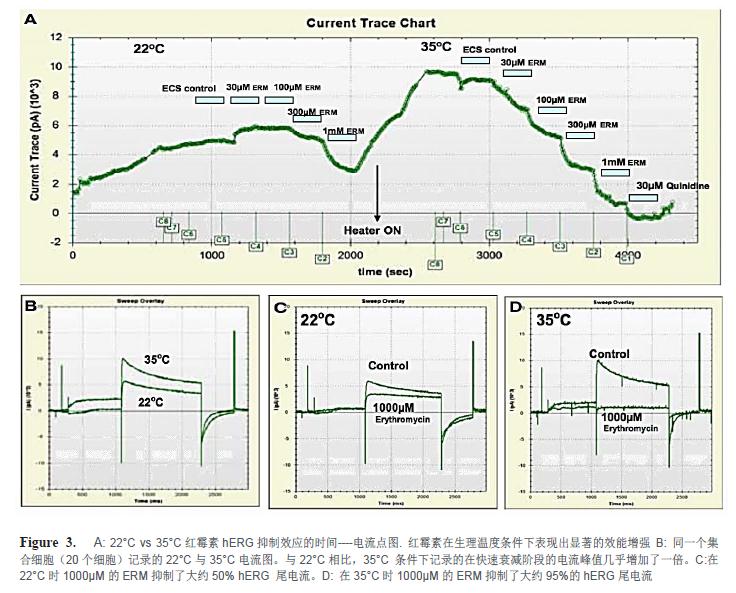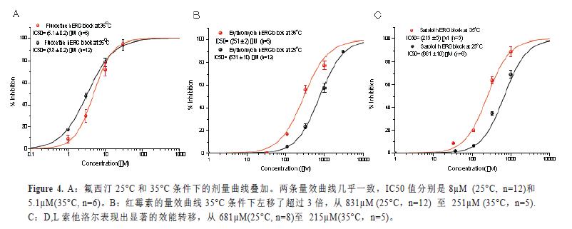氟西汀是hERG的抑制劑,其不具體有溫度依賴的效能改變。在另一個(gè)實(shí)驗(yàn)中,氟西汀作為對(duì)照品與其它兩個(gè)化合物——紅霉素和D,L索他洛爾在同一塊記錄板中進(jìn)行檢測(cè)(IF-HT,384孔)。氟西汀25°C和35°C條件下的劑量曲線疊加顯示在圖4A中。兩個(gè)量效曲線大部分重疊在一起,IC50值分別是25°C時(shí)的3.8µM和35°C時(shí)的5.1µM。相反的,紅霉素的量效曲線35°C條件下左移了超過(guò)3倍,從831µM(25°C)至251µM (35°C),見(jiàn)圖4B。D,L索他洛爾同樣表現(xiàn)出顯著的效能轉(zhuǎn)移,從681µM(25°C)至215µM(35°C),見(jiàn)圖4C。結(jié)果表明氟西汀的hERG抑制效應(yīng)對(duì)溫度不敏感,而紅霉素和索他洛爾是溫度敏感的hERG阻斷劑。這些結(jié)果與文獻(xiàn)報(bào)道的一些明顯溫度依賴性化合物的結(jié)果一致(Kirsch,G.E,2004,Stanat,S,2003,Rajamani,S,2006,Thomas,D,2002)。