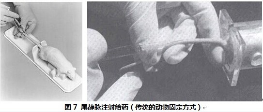 注射給藥的方法,包括肌肉、皮下、靜脈注射。注射前,傳統(tǒng)的動物固定方式采用的是固定器(如圖7所示),然而,即便動物固定后,往往也不是很配合,再加上尾靜脈注射操作難度較高,所以一次性注射的成功率較低,而且固定動物的操作花費時間較長;如果為了讓動物保持安靜,給動物進行注射麻醉,結(jié)果是注射操作容易進行,但是動物麻醉時間過長,不排除動物有死亡而無法搶救的風(fēng)險。如果在注射藥物前,首先使用異氟烷進行麻醉,將動物直接放置于實驗平臺上,帶上麻醉面罩,動物將非常安靜,有利于靜脈注射藥物,工作效率大大提高,移除面罩后,動物很快蘇醒,死亡風(fēng)險幾乎沒有,而且異氟烷不參與體內(nèi)代謝,對生理指標(biāo)不產(chǎn)生影響。