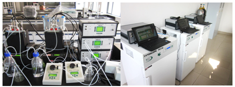 圖6.左:配備GMS150的FMT150藻類培養(yǎng)與在線監(jiān)測系統(tǒng);右:配備GMS150的FytoScopeLED光源生長箱