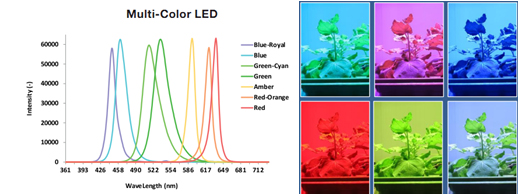 因此FytoScope在白光LED和紅藍LED以外,還配備了遠紅光光源。除了為植物生長提供最佳的光質,同時滿足植物光形態(tài)建成的需要。另外,F(xiàn)ytoScope可以提供綠光LED與紅藍LED組成三原色光源系統(tǒng),通過調(diào)整三原色的比例,能夠發(fā)出可見光譜中任意一種顏色的光,用于不同光質對植物影響的研究(圖4)。
