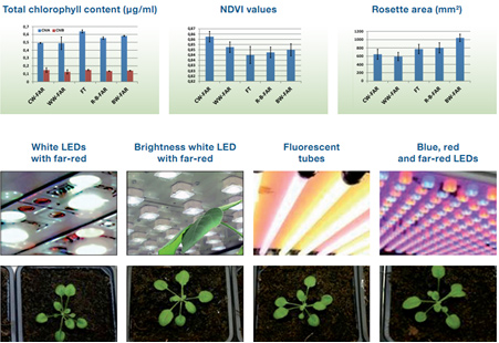 圖4. 不同光源下擬南芥的成長狀況及生理指標