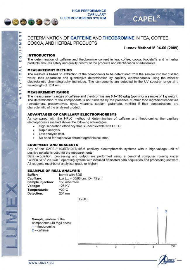 > 茶,咖啡,可可,草藥產(chǎn)品中咖啡因,可可堿的測定-LUMEX毛細(xì)管電泳法