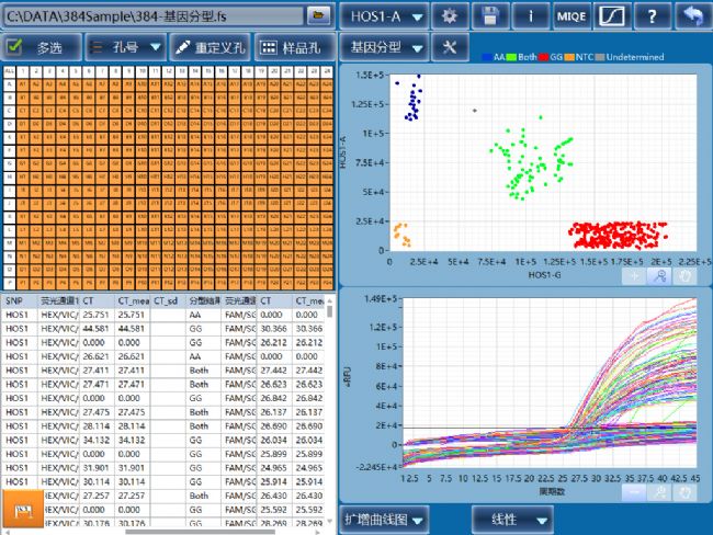 圖一為在福生生物的FS384 QPCR儀上使用5uL反應(yīng)體系的FAM和VIC兩種探針的終點(diǎn)法檢測一個(gè)位點(diǎn)的384個(gè)樣品的SNP分型結(jié)果。