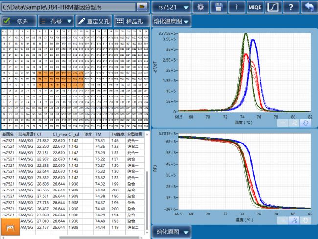 圖二為在福生生物的FS384 QPCR儀上用Touchdown PCR方法來擴(kuò)增,接著用高分辨率0.02°C 的HRM實(shí)現(xiàn)低成本的基因分型,圖中左下角的表列出了所有樣品孔,根據(jù)Tm值及其峰寬值正確判斷出每個(gè)樣品的分型結(jié)果。在這個(gè)實(shí)驗(yàn)中,兩個(gè)純合子的峰寬都小于1.5°C,而雜合子的峰寬在2°C左右。