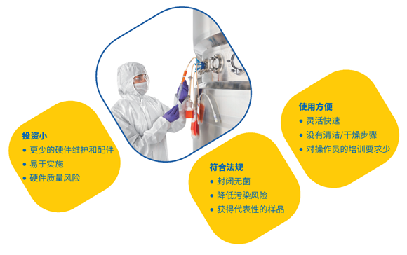 如圖2所示,與傳統(tǒng)方法相比,封閉的無菌過程采樣具有多個(gè)優(yōu)點(diǎn),包括易用性,更好地符合法規(guī)要求和有限的投資。