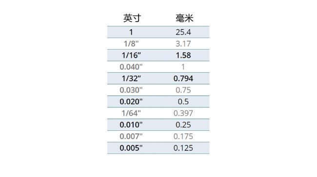 微流體導(dǎo)管尺寸通常以英寸表示,有時(shí)也會(huì)以英寸和毫米二者的混合形式表示,下表為常見的英寸-毫米單位轉(zhuǎn)換表。