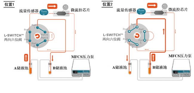 位置1:MFCS壓力泵將A儲(chǔ)液池中的流體泵出,依次經(jīng)過(guò)L-Switch的port 3和port 2、流量傳感器、微流控芯片,然后再經(jīng)過(guò)L-Switch的port4、port5和port6、port1,最后再流至B儲(chǔ)液池中。