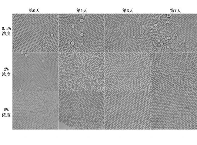在對(duì)微生物培養(yǎng)的第0,1,3和7天,觀察使用3種表面活性劑在不同濃度下所制備的液滴,獲取數(shù)據(jù)見下。