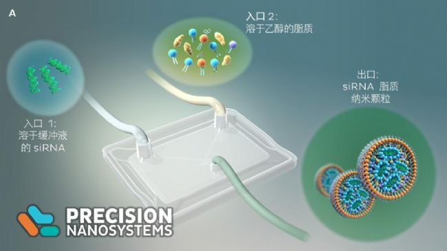 在過去,多種成分的結(jié)合使核酸脂質(zhì)納米粒的合成成為一件繁復(fù)的工作。但今天,通過使用加拿大公司Precision Nanosystems所制造的納米藥物制備系統(tǒng)可以在幾分鐘甚至幾秒內(nèi)完成納米粒子的制備。將脂質(zhì)與核酸分別溶解在水相和有機(jī)相后,納米藥物制備系統(tǒng)推動(dòng)兩相溶液通過特制芯片通道,完成納米粒子的合成。