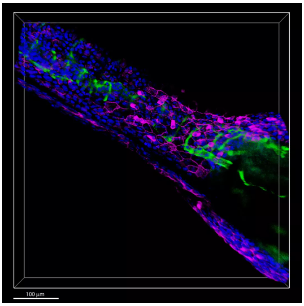 圖2 斑馬魚胚胎。用STELLARIS 8獲得3D圖像,細胞核:藍色,Hoechst;內皮細胞:綠色,EGFP;細胞膜:紫色,NIR750。樣本由法國斯特拉斯堡的IGBMC的Julien Vermot提供。