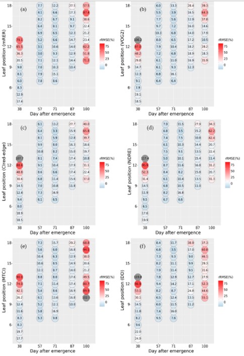 6種LCC-VI模型的rRMSE(%):(a)mRER、(b)VOG2、(c)CIred-edge、(d)NDRE、(e)MTCI 和(f) DD。rRMSE用于評估模型反演精度。rRMSE的值較低對應(yīng)于預(yù)測值和觀察值更接近。