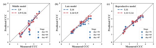 中期模型(a)、后期模型(b)和生殖模型(c)CCC預(yù)測值和2019年實測值對比。