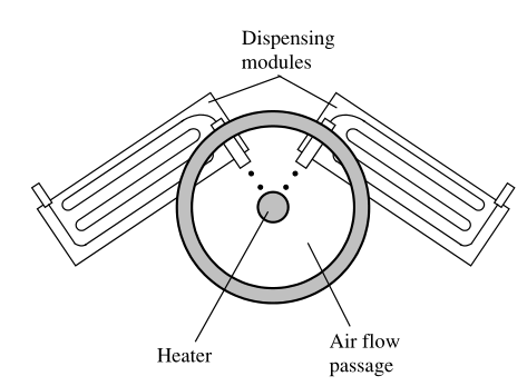 ▲ 圖2 噴墨式氣霧發(fā)生器組件示意圖。所述分配模塊以V形配置放置,使氣味滴落在集中放置的加熱器上。另一對微型分配器模塊位于草圖中顯示的模塊后面,總共有四個模塊