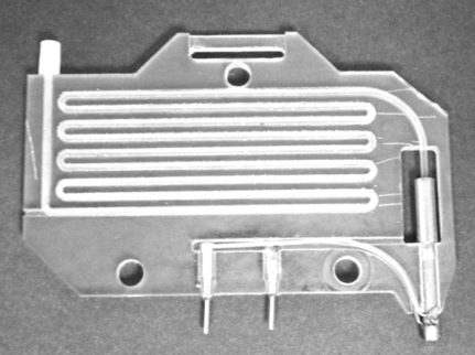 ▲ 圖3 微噴模塊示意圖。儲液器由小型特氟龍毛細(xì)管制成,并從頂部裝入氣味劑。電觸點(diǎn)插入嗅覺儀的匹配連接器,提供來自控制臺和機(jī)械支持的電子信號
