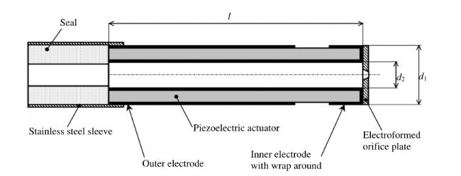 所述分發(fā)器執(zhí)行器為徑向極化方向的環(huán)形PZT5A壓電元件。壓電管的尺寸為d1= 0.070(1.78 mm), d2= 0.050(1.27 mm)和l = 0.6(15.24 mm)(圖4)。驅(qū)動電極分別沉積在內(nèi)外表面。內(nèi)電極纏繞在管子的末端,在管子的外表面,這樣更容易通電連接。金屬(鎳)鍍層從管的一端的前端和外部表面的一部分被移除,以分離兩個電極。電線被焊接到去除電鍍的帶子旁邊的電極上,在另一端,焊接到插入嗅覺器的插銷上。