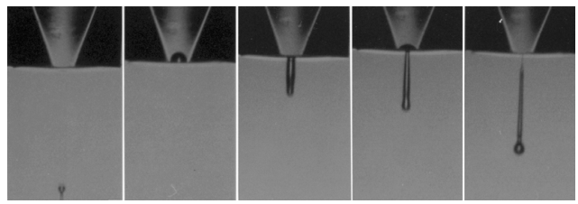 液滴產(chǎn)生遵循按需滴液(DOD)壓電噴墨打印機(jī)的原理。圖5展示了液滴形成的主要步驟。當(dāng)內(nèi)電極接地時,驅(qū)動電信號由梯形波形(“上升”,“停留”-恒定電壓,“下降”到初始電壓)組成,并應(yīng)用于外電極。在“上升”期間,壓電管的內(nèi)表面向外移動,產(chǎn)生一個負(fù)壓波,并開始向供應(yīng)管和孔板兩端移動。當(dāng)負(fù)壓波到達(dá)孔板時,液氣界面抽出到噴霧器噴嘴中(圖5,第二張照片)。在供應(yīng)端,負(fù)波作為正壓力波反射回來。“停留”周期(在最大/恒定電壓下的時間)被選擇,當(dāng)反射的正壓力波到達(dá)管的中間時,驅(qū)動信號的“下降”開始。電壓“下降”周期對應(yīng)于流體的壓縮(管壁的內(nèi)部運(yùn)動),因此加強(qiáng)了反射波,使所需電壓在恒定下降速度下最小化,或在相同的施加電壓下下降速度最大化。當(dāng)正壓力波到達(dá)理論上,它將開始噴射形成液滴的流體(圖5,第三張照片)。