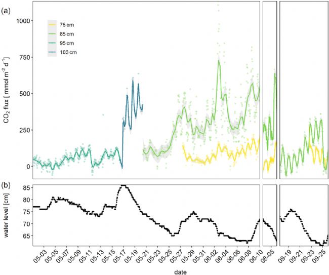 該河流表現出典型的夏季流量情況。水位大多在1m以下,因六月底出現了一次高流量,僅在初夏的6周、8月第一周和9月的短時間內出現了大量的干涸沉積物,在這些時期使用CFLUX-1全自動土壤碳通量測定系統進行CO2通量長期自動測量。CFLUX-1的位置會隨水位的變化而變化,其中5月17日,由于水位變化,CFLUX-1被移至更高處(離水位零點103cm),5月20日后水位下降,CFLUX-1被移至新出現的沉積物處。研究發(fā)現,CO2通量顯示較高的波動。整個測量階段,通量在-120~1135mmol/m2/d之間波動,平均值為149±155mmol/m2/d。在更靠近水面處測量的CO2通量比高坡度處測量的更低,變化也更小。6月份之后尤其9月份的日波動增大。