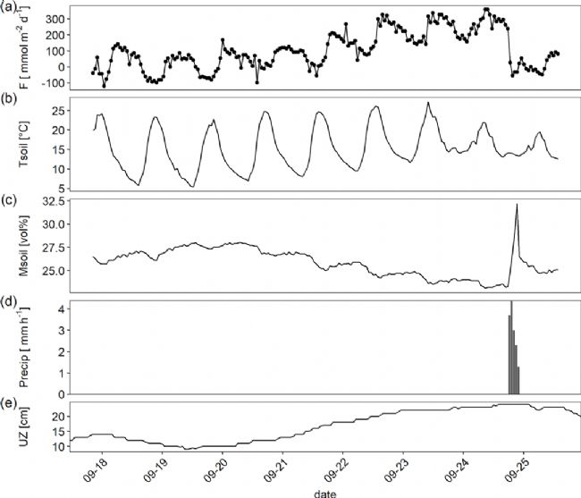 以9月份的某一周數據為例,可觀察到溫度、非飽和帶厚度和降水是如何調節(jié)CO2通量的(圖4)。溫度驅動著CO2通量非常明顯的日波動,但通量的絕對水平隨著非飽和帶厚度的增加而增大。9月25日的降水事件導致沉積物濕度突然增加,但CO2通量明顯下降。