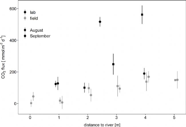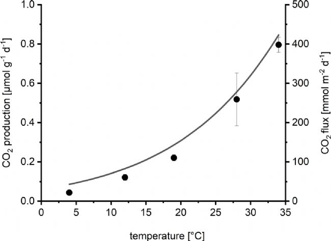 為了評估地下水脫氣,作者進行了222Rn測量。結果表明,沉積物CO2通量不是來源于地下水。為了檢驗觀察到的CO2通量是否可用沉積物中的微生物呼吸來解釋,進行了實驗室培養(yǎng)。結果發(fā)現,實驗室孵育測定的沉積物呼吸速率在8月份為0.9±0.45μmol/g/d,9月份為0.64μmol/g/d,且呼吸速率隨與河流的距離增加而增大。根據這些速率計算出的潛在CO2通量與原位測量的CO2通量相似或更高(圖6)。實驗室培養(yǎng)也進行了溫度驗證,結果也與原位測量的溫度響應相似(圖7)。因此,沉積物呼吸足以解釋觀測到的CO2排放。