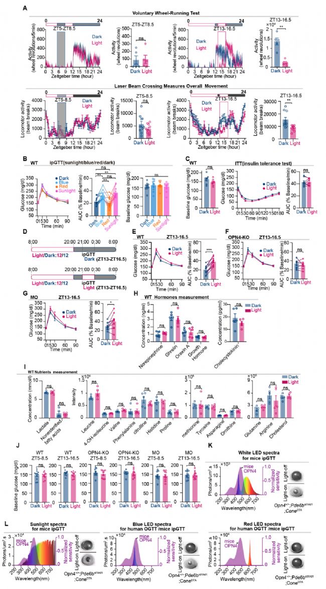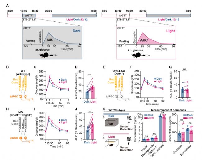 作者首先在暗/光照射下對小鼠進行了葡萄糖耐量試驗(IPGTT)以確定光對葡萄糖代謝的影響,并將葡萄糖耐量(GT)量化為曲線下面積(AUC)。結(jié)果發(fā)現(xiàn)與在光照下測試的野生型(WT)小鼠相比,在黑暗條件下測試的小鼠表現(xiàn)出顯著更低的AUC(表明GT增加)。此外還發(fā)現(xiàn)當光可以有效激活ipRGCs時,光可調(diào)節(jié)GT,同時也證實了光對GT的影響與晝夜節(jié)律階段(白天或夜晚)無關(guān)(圖1)。