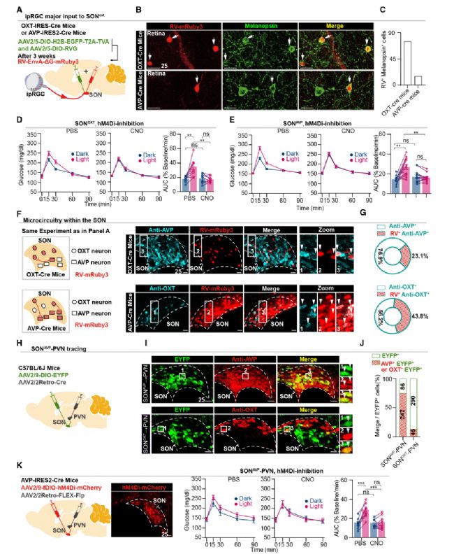SON主要包含兩種神經(jīng)元亞型,抗利尿激素(AVP)和催產(chǎn)素(OXT)能神經(jīng)元。結(jié)合神經(jīng)環(huán)路示蹤和操控手段,發(fā)現(xiàn)SONOXT和SONAVP神經(jīng)元都接收了來自ipRGCs的投射,SONOXT逆行標記的ipRGCs大約是SONAVP的5倍。通過化學(xué)遺傳學(xué)抑制兩類神經(jīng)元,發(fā)現(xiàn)光照下的AUC降低到黑暗中觀察到的水平。這些數(shù)據(jù)表明SONOXT和SONAVP神經(jīng)元都是GT光調(diào)控所必需的。此外,也發(fā)現(xiàn)了SONAVP和SONOXT神經(jīng)元之間的相互投射。已知SON會投射到下丘腦室旁核(PVN),這是控制新陳代謝的重要大腦區(qū)域。作者也證實了SONAVP神經(jīng)元是SON到PVN的主要輸出神經(jīng)元(圖4)。