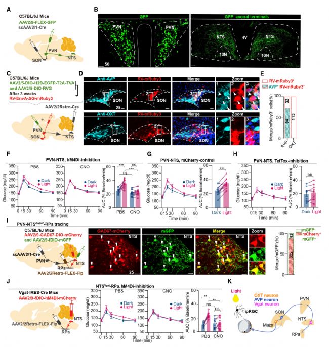 作者進一步通過追蹤等實驗研究了光調(diào)節(jié)GT通路中的下游靶點,使GFP在SON支配的PVN神經(jīng)元中選擇性表達,發(fā)現(xiàn)在髓質(zhì)的孤束核(NTS)中有密集的GFP陽性軸突末端標記。SONAVP,而不是SONOXT神經(jīng)元作為輸出神經(jīng)元,通過PVN控制NTS。追蹤實驗還發(fā)現(xiàn)向RPa(中縫蒼白核)傳遞PVN輸入的NTS神經(jīng)元主要是GABA能神經(jīng)元。結(jié)果表明光通過ipRGC-SONOXT-SONAVP-PVN-NTSVgat(孤束核的GABA能抑制性神經(jīng)元)-RPa通路調(diào)節(jié)GT(圖5)。