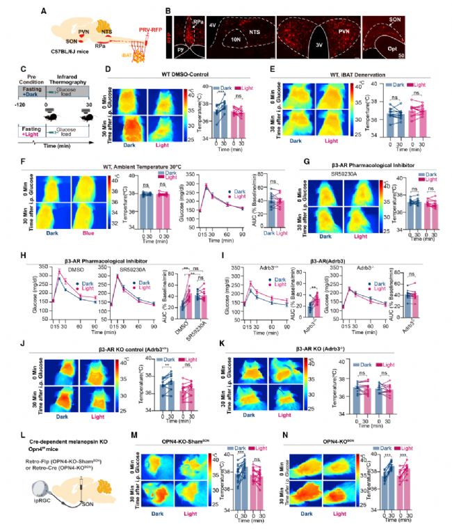 位于RPa內(nèi)的交感前運動神經(jīng)元可直接調(diào)節(jié)棕色脂肪組織(BAT)產(chǎn)熱,作者進一步研究了光是否調(diào)節(jié)BAT產(chǎn)熱。在黑暗條件下,單次葡萄糖注射誘導(dǎo)了BAT產(chǎn)熱的適應(yīng)性變化,iBAT表面溫度升高,而光則阻礙了這種適應(yīng)性產(chǎn)熱。同時肩胛內(nèi)表面溫度升高主要由iBAT驅(qū)動,而不是由白色/米色脂肪組織驅(qū)動。這表明光確實通過交感神經(jīng)通路調(diào)節(jié)葡萄糖誘導(dǎo)的BAT產(chǎn)熱。在基因敲除小鼠模型研究中發(fā)現(xiàn)光通過β3-腎上腺素能信號通路阻斷BAT介導(dǎo)的適應(yīng)性產(chǎn)熱,從而降低GT。進一步研究發(fā)現(xiàn)當選擇性抑制神經(jīng)通路,即SONAVP-PVN, PVN-NTS和NTSVgat -RPa時,光壓抑BAT介導(dǎo)的適應(yīng)性產(chǎn)熱現(xiàn)象消失。表明光通過視網(wǎng)膜ipRGC-SON-PVN-NTS-RPa通路阻斷了BAT的適應(yīng)性產(chǎn)熱,從而降低了GT(圖6)。
