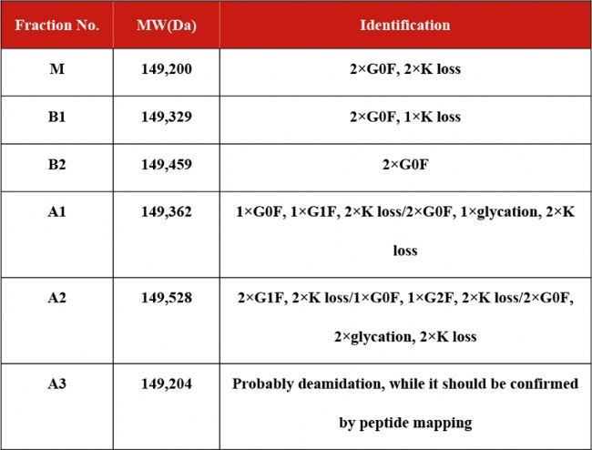 表3列出了iCIEF-MS鑒定到的bevacizumab電荷變異體。對(duì)于酸峰中常見(jiàn)的脫酰胺化修飾,由于其修飾后分子量?jī)H增加0.984Da,通常需要在肽圖層面上進(jìn)一步確認(rèn)。