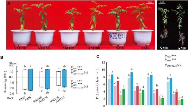 1. AM提高宿主幼苗的耐鹽性結(jié)果顯示,相比于NM,AM共生情況下幼苗的鹽脅迫效應(yīng)更弱。此外發(fā)現(xiàn),AM共生顯著提高了鹽脅迫下宿主的生物量、凈光合速率和抗氧化系統(tǒng)。