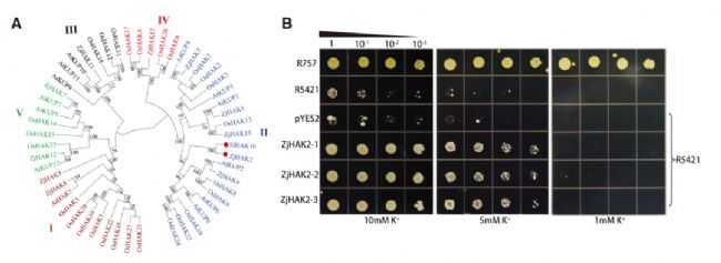 圖5 ZjHAK2在酵母中的系統(tǒng)發(fā)育分析及功能鑒定