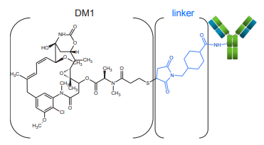 圖1. 細胞毒藥物有效載荷和連接子與mAb偶聯(lián)的示意圖。T-DM1由DM1(黑色),靶向連接氨基殘基的MCC連接子(linker,藍色)和單克隆抗體組成。