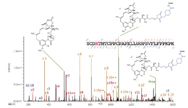 圖2. 應用Zeno EAD得到的偶聯(lián)肽SCDK [DM1] THTCPPCPAPELLGGPSVFLFPPKPK(z =+4)的碎片數(shù)據(jù)。來自肽段主鏈指定偶聯(lián)肽段離子的全掃描MS / MS數(shù)據(jù),以及有效載荷中的碎離子信息。