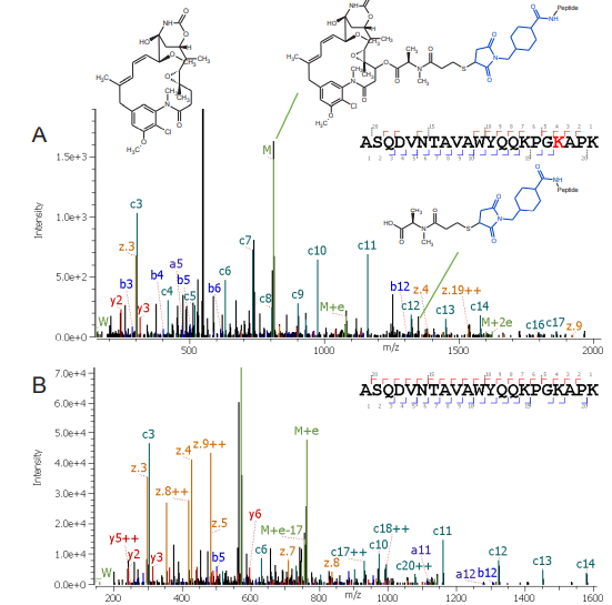 圖3. 應用Zeno EAD得到的來自偶聯(lián)/非偶聯(lián)肽ASQDVNTAVAWYQQKPGK [DM1] APK(z =+3)的碎片的數(shù)據(jù)。A:來自肽段主鏈指定偶聯(lián)肽段離子的全掃描MS / MS數(shù)據(jù),以及有效載荷中的碎離子信息。B:來自肽段主鏈指定非偶聯(lián)肽的全掃描MS / MS數(shù)據(jù)。 連接子顯示為藍色,DM1藥物顯示為黑色。