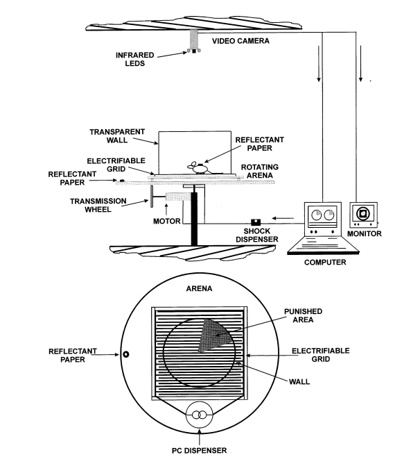 該裝置由一個(gè)高架測(cè)試場(chǎng)組成,網(wǎng)格地板有一個(gè)透明的圓形邊界,側(cè)壁安裝視頻采集系統(tǒng)。測(cè)試場(chǎng)地順時(shí)針旋轉(zhuǎn)(1轉(zhuǎn)/分),電刺激可以通過網(wǎng)格地板傳遞。在適應(yīng)后的第二天,小鼠每天進(jìn)行4或5天的訓(xùn)練,每天訓(xùn)練小鼠持續(xù)10 min,避免 60° 的電擊區(qū),進(jìn)入后導(dǎo)致短暫的足部電擊(500 ms,0.5 mA)。為了確定它們對(duì)電擊區(qū)的記憶,在最后一次訓(xùn)練結(jié)束24小時(shí)后,小鼠被允許在不施加電擊的情況下探索場(chǎng)地10 min。使用視頻行為學(xué)系統(tǒng)軟件跟蹤分析動(dòng)物行為。