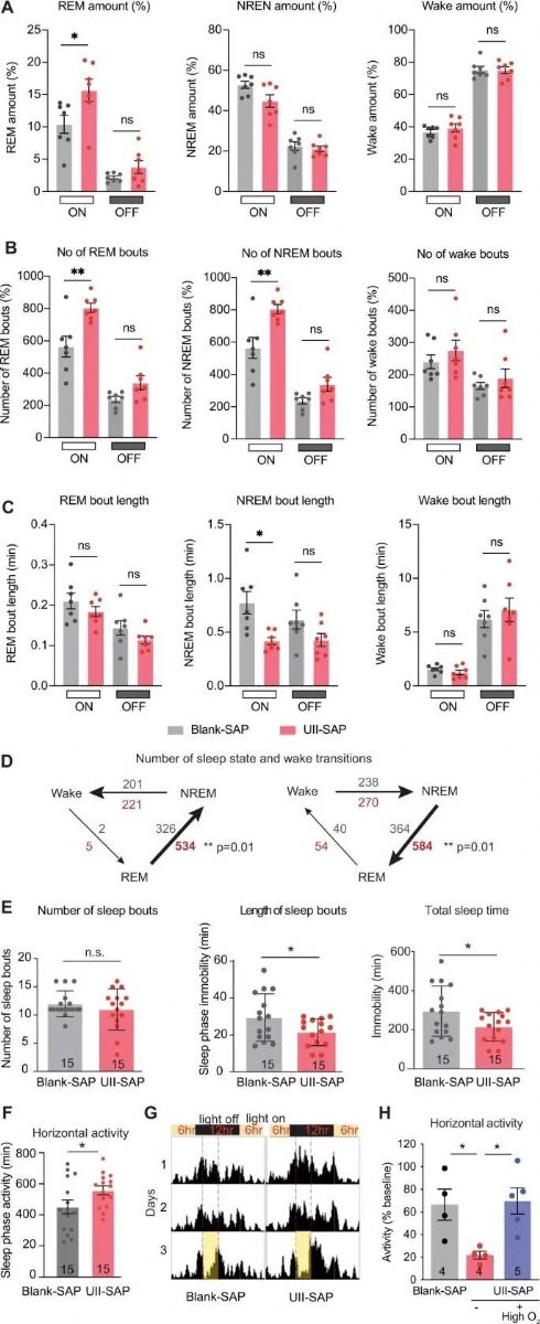 H實(shí)驗(yàn)第3天12 h光期3h弱光期的活動(dòng)時(shí)間。在注射UII-SAP(紫色)后2周開始的睡眠期2周內(nèi),小鼠每天放置40%含氧(高氧o2)8小時(shí),與注射UTII-SAP的小鼠相比,沒有睡眠不足。