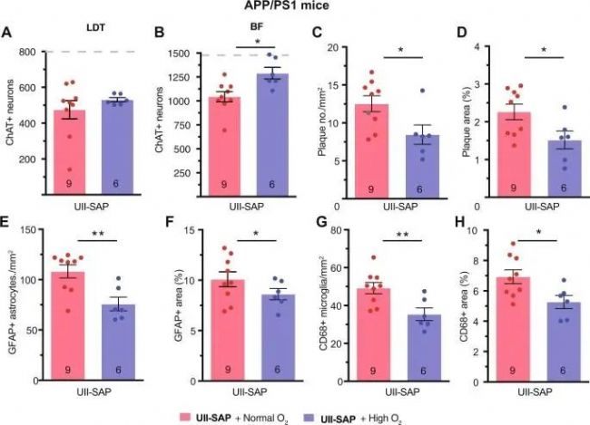 APP/PS1小鼠注射UII-SAP并經(jīng)常氧或高氧處理后,